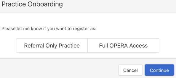 It's important to select the right type of practice. If you are undertaking commissioned community eye careservices, such as CUES or MECS, you will need full OPERA Access. If you are part of the eERS schemeonly, then you can select referral-only practice.