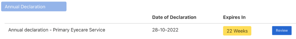 To make the declaration, click 'Review' within the Annual Declaration section; the 'expires in' section will count down to the new NHS year on the 1st April: