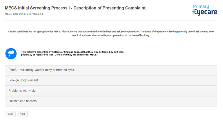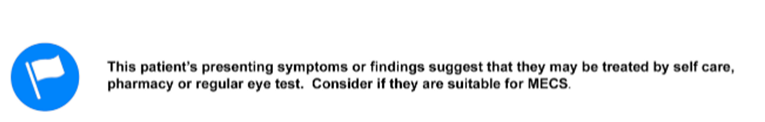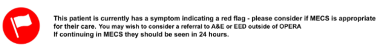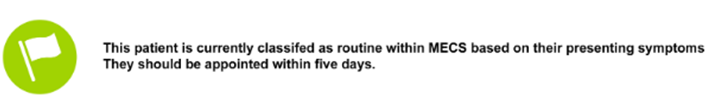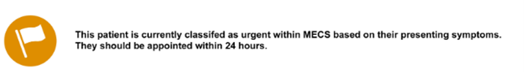 Then use the screening tool to help you decide on whether the patient is eligible for the MECS service along with the required urgency. The flag at the top will change colour and will suggest a screening outcome.