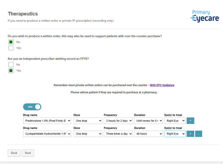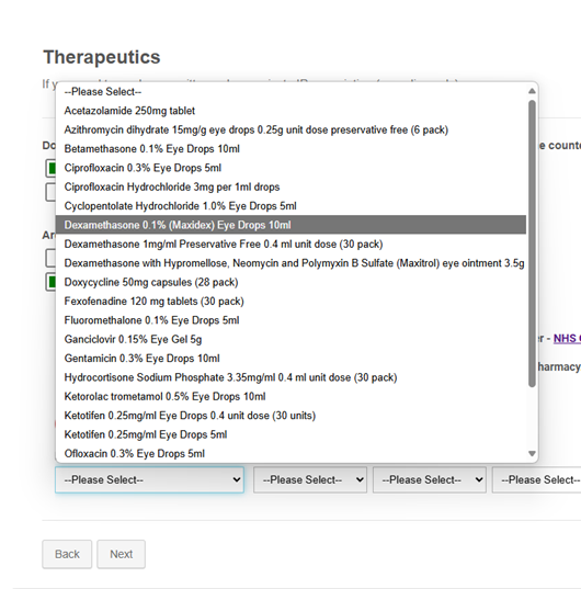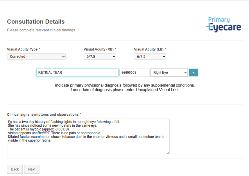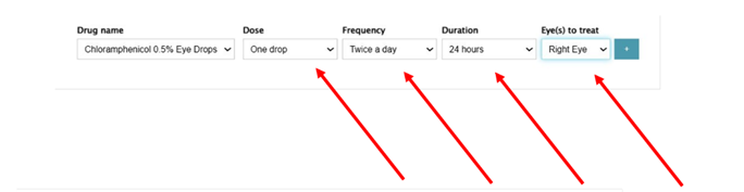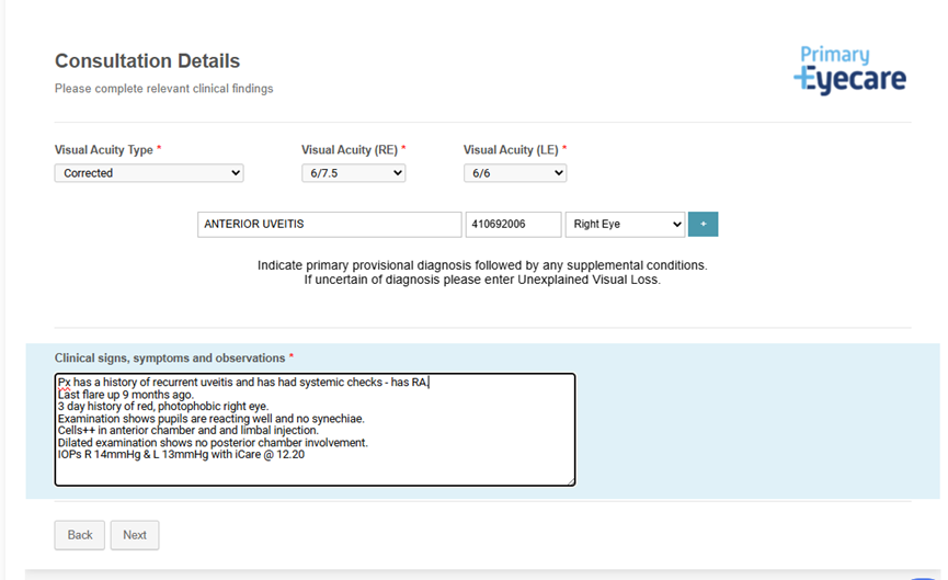 As well as selecting which eye is affected, you can add multiple diagnoses by selecting “+” and finding a condition in the second selection box