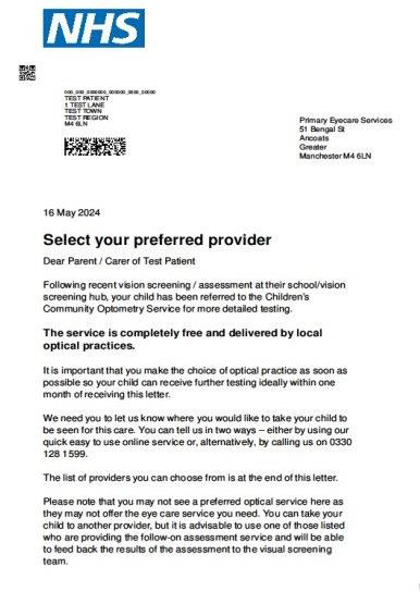 - Primary Eyecare Services send parent/guardian a letter detailing the next steps, including access to the patient choice portal where they can choose which local optometry practice to attend.
