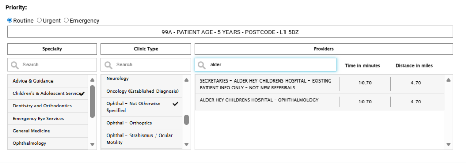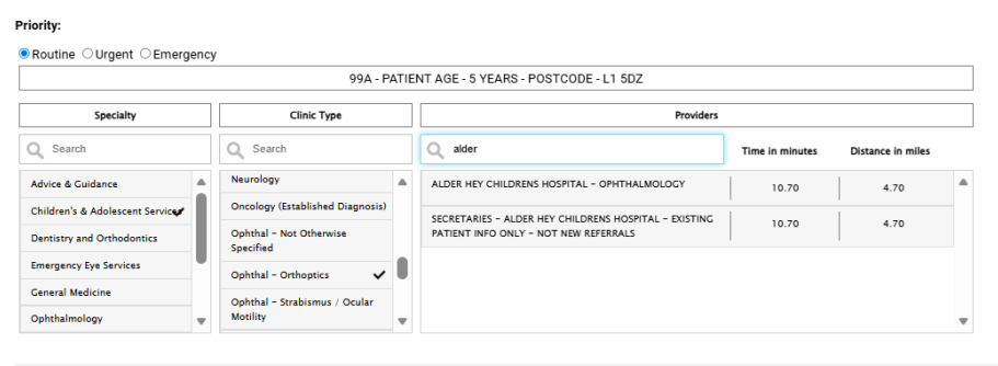 You can select which priority the patient's case is. Then select 'Children's & Adolescent Service' under 'Specialty' and the relevant clinic type for the patient. Search for Alder Hey Children's Hospital under the 'Providers' section.